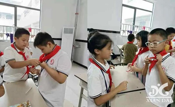 班队会课上,各班班主任从整理红领巾到系上脖子,一系列细节进行了详细的讲解和示范。“将红领巾披在肩上,钝角对准脊椎骨,右角放在左角下面,两角交叉……”经过老师们细心的讲解和指导,同学们都能够快速、准确地佩戴红领巾。一条条整洁的红领巾在胸前飘扬,孩子们的脸上都写满骄傲与自豪。