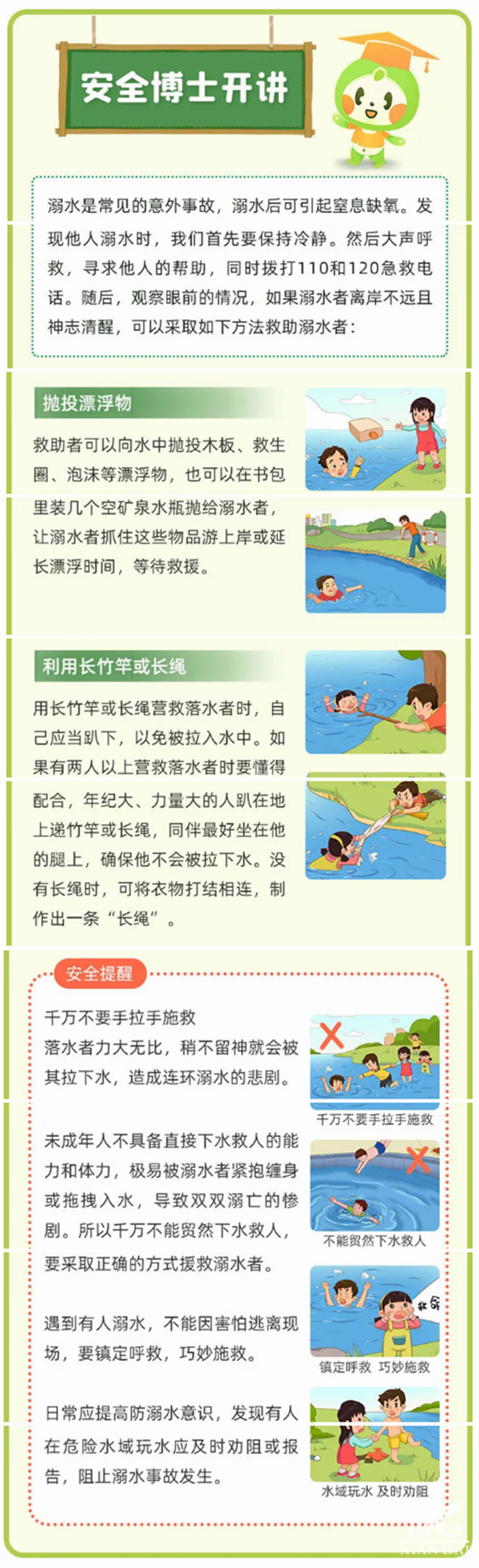 随着气温逐渐升高,未成年学生溺水安全风险逐步增大。加强对孩子的安全教育和管理显得尤为重要,特别是加强放学后、周末、节假日期间和孩子结伴外出游玩时的管理。中教君整理了一些关于防范溺水的安全漫画,老师和家长们请收藏~