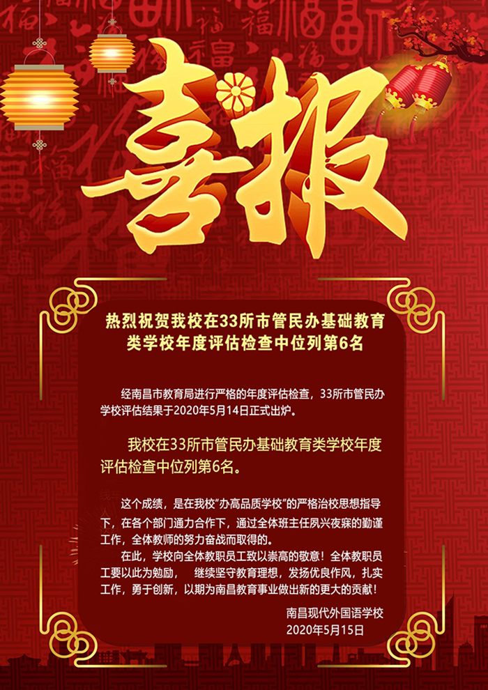根据民办教育相关法律法规和《南昌市教育局关于印发〈南昌市民办教育机构年检实施办法〉的通知》(洪教社管字〔2019〕]21 号),南昌市教育局对33所市管民办学校组织实施了年度评估检查。经过严格的年度评估检查,5月14日,南昌市教育局正式发布了33所市管民办学校评估结果。其中,江西省重点中学——beat365中国唯一官网在此次评估检查中喜获第六名的佳绩。