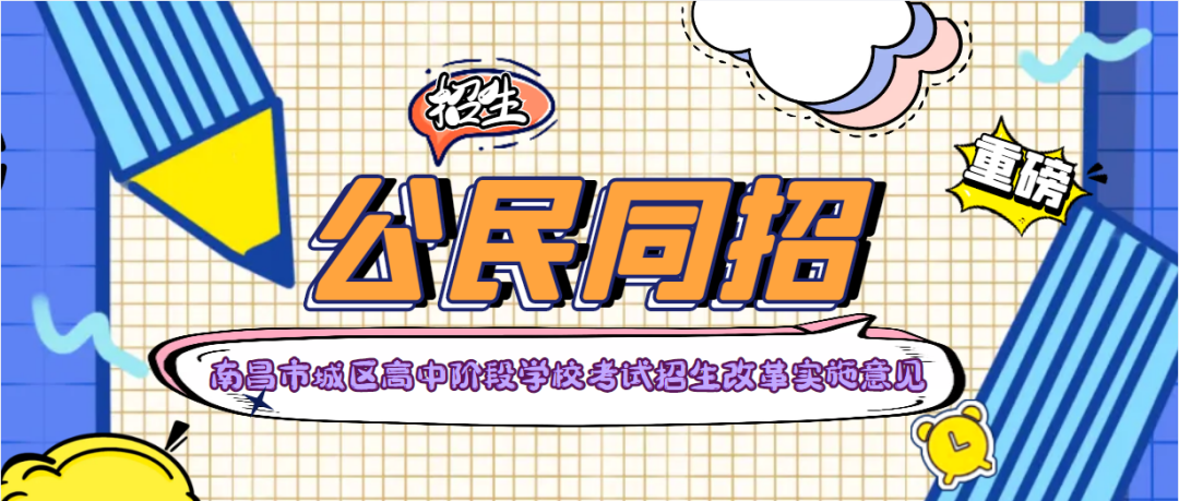 为积极落实教育部、江西省教育厅提出的普通高中“公民同招”政策要求,进一步满足新时代科学选才和招录多样化的需要,进一步规范普通高中招生秩序和招生行为,有效维护教育公平,自2022年11月以来,南昌市教育局在出台《南昌市城区高中阶段学校考试招生改革实施意见》的基础上,积极推进改革体系建设,重点从合并批次、志愿增设、优化招录环节、特长生招生等方面规划和推进综合配套改革工作,并将于2023年秋季招生时,实施城区“公民同招”改革。