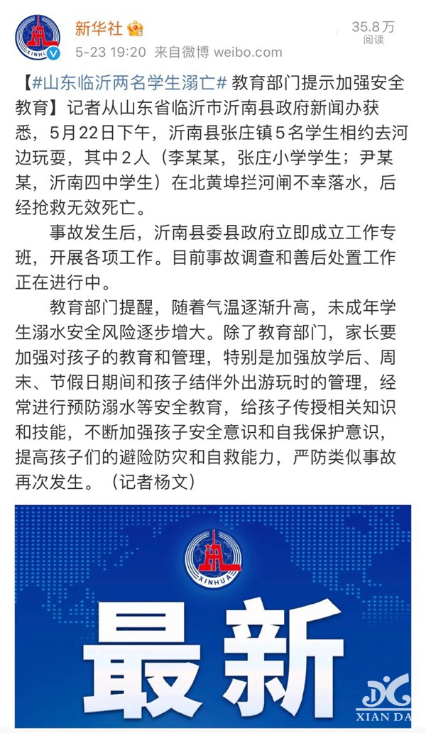 同日,山东省临沂市沂南县张庄镇5名学生相约去河边玩耍,其中2人(李某某,张庄小学学生;尹某某,沂南四中学生)在北黄埠拦河闸不幸落水,后经抢救无效死亡。