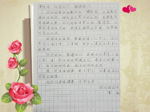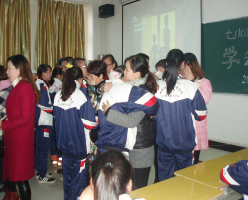 在感恩父母的环节中,主持人展示一系列关于自己父母的问题向同学们提问,考查同学们对自己父母的了解程度。紧接着播放视频《人的一生,感恩教育》 ,短片中浮现出我们从小到长大成人及父母从年轻到年迈各阶段的特征,旨在培养学生的感恩之心。视频过后,展示的是一名叫章钰同学写给爷爷奶奶的一封信。章钰三岁时,父母就分开了,爷爷奶奶抚养了章钰整整十年。在这十年间,爷爷奶奶承担了太多本该章钰父母承担的责任。寒冬里,他们起早床,为孙女准备早餐,洗衣服。晚上,悉心为孙女盖被子。十年间,章钰在慢慢长大,爷爷奶奶却在慢慢变老。借此机会,章钰同学利用攒下的零花钱,为爷爷奶奶献上了一份真挚的礼物,感谢他们的养育之恩。此时,《时间都去哪了》从耳边传来,三人相拥而泣。情到深处,感人肺腑,全场为之动容,在座的校长、老师、家长、同学们都流下感动的泪水。借着章钰同学对爷爷奶奶的深情倾诉,主题班会来到了此环节的后一部分,部分同学给父母献礼,同学们纷纷感激父母的养育之恩,对自己的不懂事表示深深的愧疚。